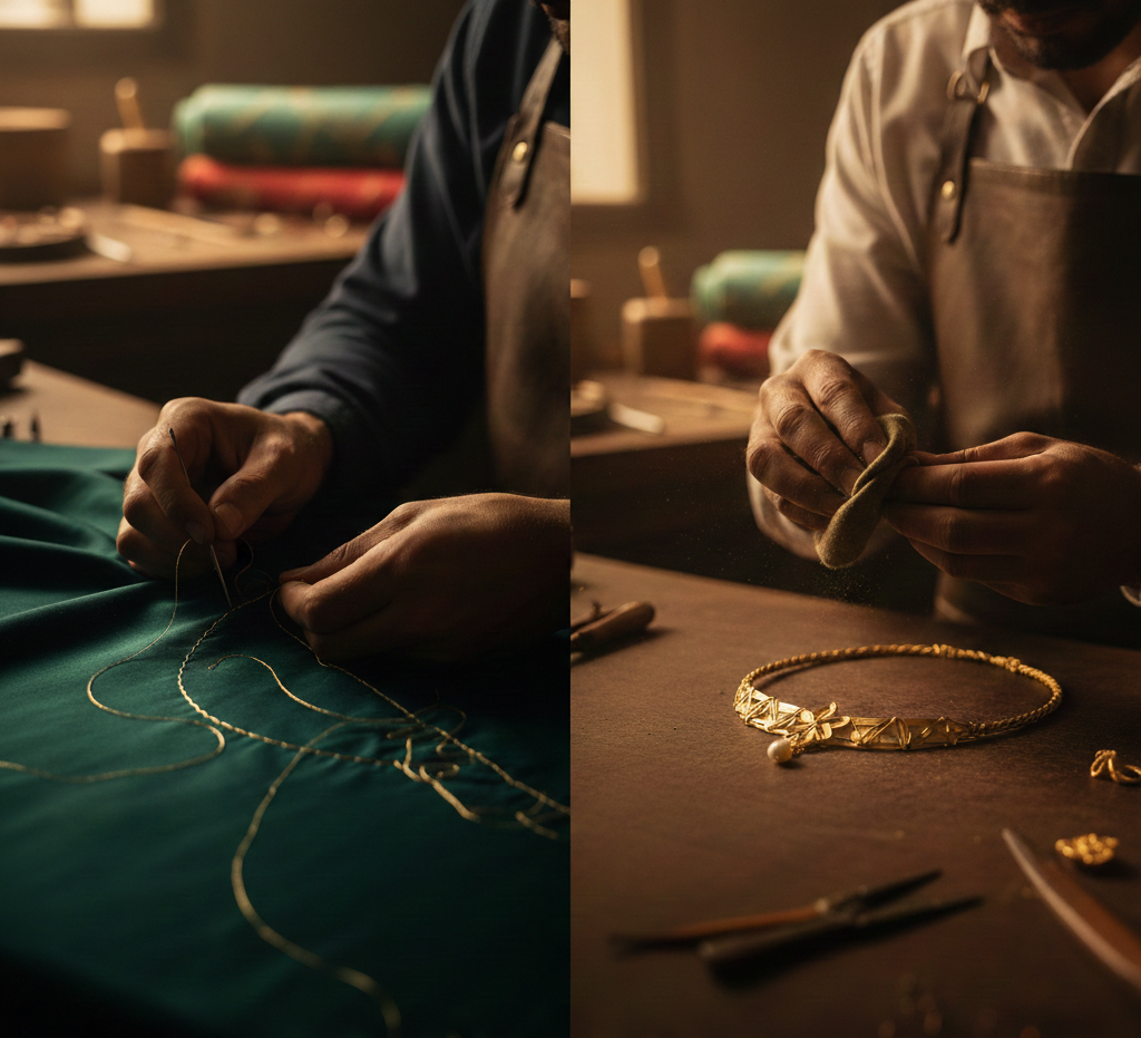 At Salaaj, we believe luxury lies in the details. Every stitch in our garments and every curve in our jewellery is a tribute to the artisans who preserve our rich heritage. We blend traditional techniques with contemporary designs to create pieces that aren’t just worn, but cherished for generations.